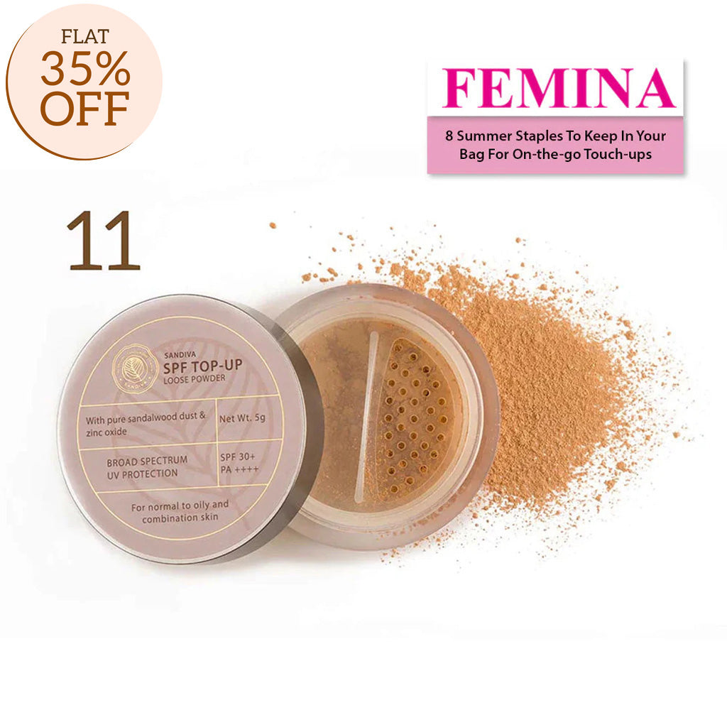 Enter SPF Top-Up Loose Powder- Sandiva’s unique solution to this everyday problem- just dab on like a compact or any finishing powder for lightweight coverage but heavy duty sun-protection.
